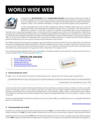 El documento habla sobre la World Wide Web (WWW) o la web. Explica que la web fue desarrollada entre 1989 y 1990 por Tim Berners-Lee en el CERN para compartir información de manera hipertextual. También describe brevemente la evolución de la web 1.0 a la web 2.0 y menciona algunas características de la web 3.0 como el uso de inteligencia artificial y datos semánticos.
