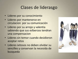 El documento describe las características de un líder y los diferentes tipos de liderazgo. Un líder orienta y dirige a otros utilizando sus conocimientos y habilidades en diversos ámbitos como la familia, el trabajo y las amistades. Existen líderes por su conocimiento, comunicación, valentía, capacidad de aceptar retos y mantener la sencillez. Los obstáculos del liderazgo incluyen actitudes equivocadas y fallas en la comunicación o conocimientos.