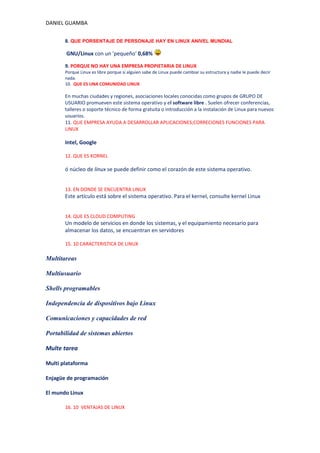 El documento proporciona información sobre Linux, incluyendo su historia, características, ventajas y desventajas. Se describe a Linux como un sistema operativo de código abierto desarrollado originalmente por Linus Torvalds y otros contribuyentes. También se mencionan algunas de las empresas y personas clave involucradas en el desarrollo de Linux a lo largo de los años. Finalmente, se enumeran varias características, ventajas y desventajas comunes de Linux.