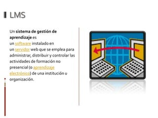 Un sistema de gestión de aprendizaje (LMS) es un software instalado en un servidor web que permite administrar, distribuir y controlar actividades de formación no presencial. Un LMS gestiona usuarios, recursos, materiales y actividades de aprendizaje, controla el progreso y genera informes. Ofrece funciones como foros de discusión y videoconferencias.