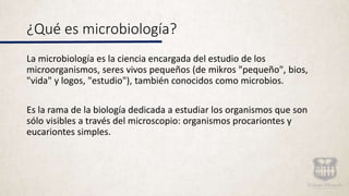 La microbiología es la rama de la biología que estudia los microorganismos como bacterias, hongos y protozoos que solo son visibles a través de un microscopio. Se divide en subdisciplinas como la fisiología microbiana, genética microbiana y microbiología médica, clínica, ambiental e industrial. A pesar de los amplios conocimientos actuales, solo se ha estudiado el 1% de los microbios existentes.
