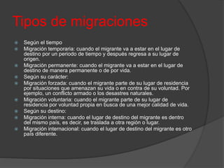 La migración implica el desplazamiento de personas desde su lugar de residencia habitual hacia otro lugar, ya sea de manera temporal o permanente, voluntaria o forzada, y dentro de un mismo país o entre países diferentes. Las migraciones responden a diversas causas como buscar una mejor calidad de vida, escapar de conflictos armados o desastres naturales, o superar las desigualdades determinadas por el lugar de nacimiento.