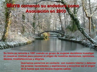 La Asociación Mirra se fundó en 2003 para promover el liderazgo de la mujer a través del desarrollo personal y la toma de conciencia. El grupo se formó en 1997 cuando un grupo de mujeres comenzó un viaje de autodescubrimiento interior para comprender mejor sus deseos y necesidades. A través de este proceso, descubrieron que cada mujer puede tomar el control de su propia vida y expresar libremente su singularidad. La asociación ofrece foros, seminarios y otras actividades para ayudar a las mujeres a fortalecerse a sí mismas