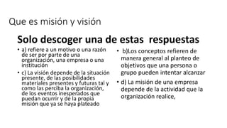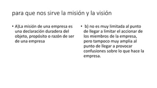 La misión de una empresa se refiere a su razón de ser y depende de su actividad principal, mientras que la visión depende de la situación actual y futura de la organización y puede evolucionar. Tanto la misión como la visión son declaraciones que ayudan a una empresa a establecer objetivos a largo plazo y a guiar las acciones de sus miembros.