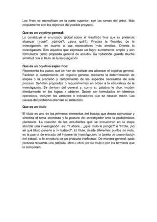 El documento explica qué son los objetivos de una investigación. Los objetivos identifican claramente lo que se pretende lograr y consisten en un objetivo general amplio y objetivos específicos más detallados. También describe los tipos de intereses que pueden motivar una investigación, como intereses personales e institucionales. Explica que un objetivo general enuncia el resultado final buscado, mientras que los objetivos específicos señalan las etapas necesarias para alcanzarlo. Además, brinda detalles sobre cómo analizar los objetivos y define qué