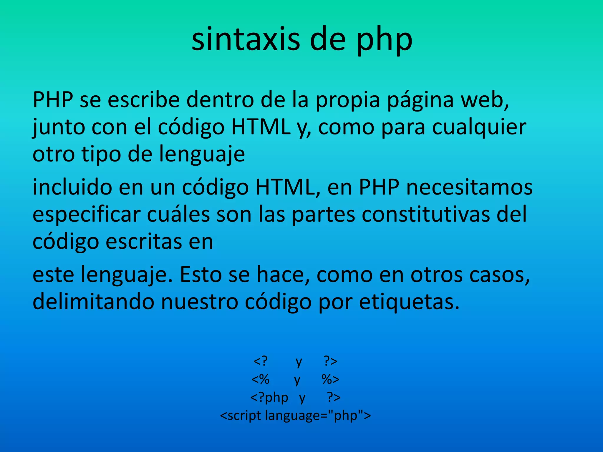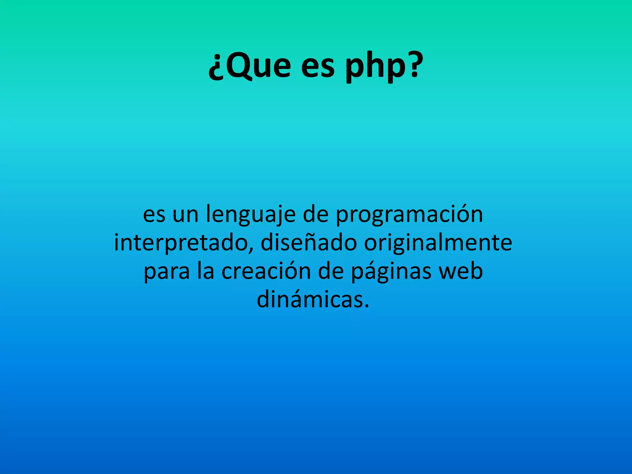 PHP es un lenguaje de programación interpretado originalmente diseñado para crear páginas web dinámicas. Se escribe dentro de la página web entre etiquetas especiales como <?php ?> y permite el uso de funciones para cambiar caracteres, acceder a bases de datos como mySQL y mostrar contenido dinámico.