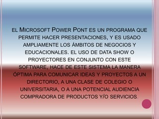 Microsoft PowerPoint es un programa que permite crear presentaciones mediante diapositivas. Ofrece características como interfaz gráfica intuitiva, galería de gráficos y diagramas, temas y estilos rápidos, personalización, efectos, formatos de texto avanzados e importación y exportación de archivos. PowerPoint permite insertar diferentes elementos como imágenes, tablas, diagramas, videos, botones de acción e hipervínculos. También incluye una variedad de efectos de transición entre diapositivas.