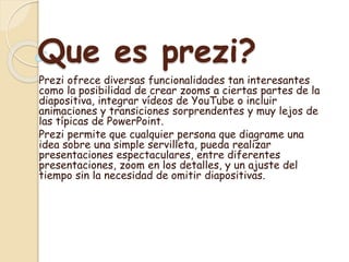 Prezi ofrece funcionalidades interesantes como crear zooms en diapositivas, integrar videos de YouTube e incluir animaciones y transiciones diferentes a las de PowerPoint. Prezi permite crear presentaciones espectaculares moviéndose entre secciones, enfocándose en detalles y ajustando el tiempo sin omitir diapositivas.