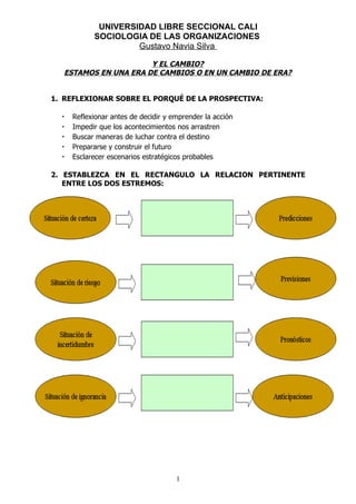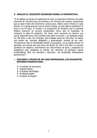 Este documento discute los desafíos y oportunidades del cambio constante en la era moderna. Argumenta que debemos reflexionar antes de actuar para guiar el futuro en lugar de dejarnos arrastrar por los acontecimientos. También analiza un escenario futuro donde la esperanza de vida se duplica, lo que crearía desafíos para los sistemas de jubilación y educación.