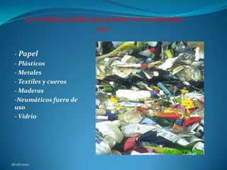 El reciclaje es un proceso importante para cuidar el medio ambiente mediante el cual los materiales como papel, plástico, vidrio y metales son recolectados y transformados en nuevos productos. Al reciclar se ahorran recursos naturales, se reduce la contaminación y se alarga la vida útil de los materiales.