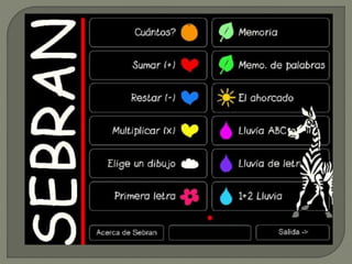 Sebran's ABC es un programa con juegos educativos para niños en diferentes idiomas que ayuda a familiarizarse con números, letras y colores mientras se divierten. Los juegos desarrollan habilidades de lectura, escritura, memoria, identificación de objetos y resolución de operaciones matemáticas, además de fomentar la interacción y sociabilización entre varias personas.