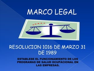 La seguridad industrial es el conjunto de actividades orientadas a reconocer, evaluar y controlar los riesgos laborales para reducir los accidentes y enfermedades ocupacionales. La ley 1016 de 1989 establece que los empleadores deben elaborar mapas de riesgos, inspeccionar equipos, y tener programas de mantenimiento, análisis de elementos de protección personal e investigación de accidentes. La metodología incluye sensibilización, identificación de riesgos, talleres integrales, análisis de informes y seguimiento.