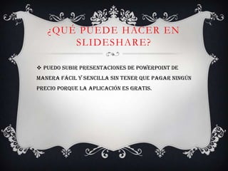 SlideShare es un sitio web gratuito donde los usuarios pueden subir y compartir presentaciones en formatos como PowerPoint, Word, PDF y OpenOffice de manera pública o privada, y acceder a una gran biblioteca de presentaciones subidas por otros.