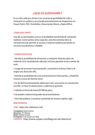 SlideShare es un sitio web que permite a los usuarios subir y compartir presentaciones de diapositivas, documentos PDF, portafolios y archivos de Word de manera pública o privada. Los usuarios pueden almacenar y compartir material audiovisual sin adjuntar archivos pesados en correos electrónicos, y crear presentaciones interesantes con música o voces. SlideShare ofrece una forma fácil y gratuita de publicar y socializar contenido.