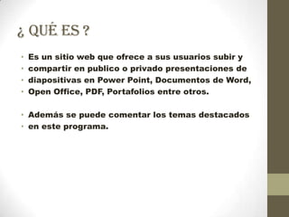 SlideShare es un sitio web que permite a los usuarios subir y compartir presentaciones de diapositivas en formatos como PowerPoint y PDF, ya sea de forma pública o privada. Los usuarios también pueden comentar las presentaciones subidas. SlideShare fue lanzado en 2006 y es similar a YouTube pero enfocado en presentaciones, recibiendo alrededor de 12 millones de visitantes al mes. Fue adquirido por LinkedIn en 2012.