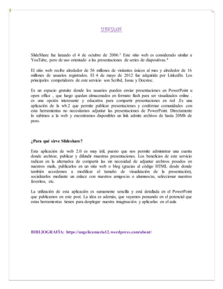 SlideShare es un sitio web lanzado en 2006 para compartir presentaciones en formato de diapositivas de manera similar a YouTube. Más de 56 millones de usuarios visitan el sitio cada mes y 16 millones están registrados. SlideShare permite a los usuarios subir presentaciones de PowerPoint u OpenOffice para que otros puedan verlas en línea de forma gratuita. La aplicación es útil para compartir presentaciones sin adjuntar archivos pesados en correos electrónicos y permite socializar las presentaciones a través de enlaces.