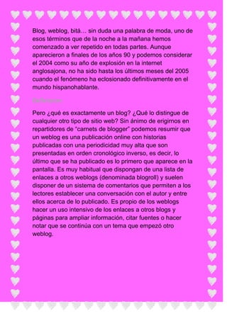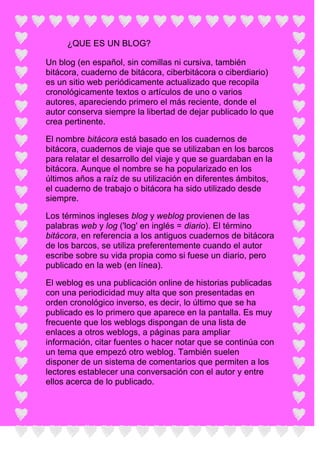 Un blog es un sitio web periódicamente actualizado que recopila cronológicamente artículos de uno o más autores, mostrando primero el artículo más reciente. Los blogs derivan de los cuadernos de bitácora usados en barcos para relatar viajes. Comúnmente los blogs presentan artículos en orden cronológico inverso y permiten comentarios de lectores.