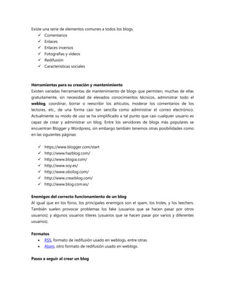 Un blog es un sitio web que recopila cronológicamente artículos de uno o más autores. Los lectores pueden comentar y los autores responder, permitiendo un diálogo. Existen blogs de diferentes temas como periodismo, tecnología o política. Actualmente, existen diversas herramientas que facilitan la creación y mantenimiento de blogs sin necesidad de conocimientos técnicos. Algunos de los servicios más populares son Blogger y Wordpress.