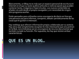 Los blogs son sitios web donde se publican mensajes de uno o más autores sobre una temática de forma cronológica. Son espacios personales de escritura en internet donde se comparten artículos, imágenes e hipervínculos. Los blogs sirven para informar, compartir y debatir sobre temas de interés de forma periódica. El blog más popular del mundo se encuentra en China y pertenece a una famosa actriz y cantante.