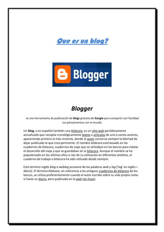 Un blog es un sitio web periódicamente actualizado donde uno o más autores comparten sus pensamientos y artículos de forma cronológica, con las publicaciones más recientes primero. Los blogs permiten a los autores publicar libremente lo que consideren pertinente y derivan su nombre de los cuadernos de bitácora usados en barcos para relatar viajes.