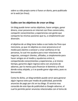 Un blog es un sitio web donde uno o más autores comparten experiencias, conocimientos y otras entradas de forma cronológica a través de texto, imágenes y videos. Los blogs permiten interacción a través de comentarios y su objetivo es actualizarse constantemente para mantener el interés de los lectores. Las páginas web suelen ser más estáticas y enfocarse en presentar información sobre una empresa u organización.