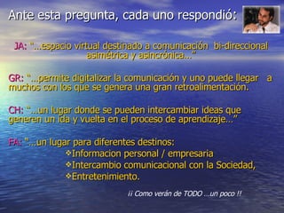 El documento explora la definición de un blog como un espacio virtual para la comunicación bidireccional y su evolución desde una simple bitácora a un medio diversificado que abarca distintos tipos, como personal, educativo y corporativo. Resalta las ventajas, como su fácil acceso y actualización constante, así como desventajas como la falta de presentación formal y el posible bajo retorno comunicacional. Además, se menciona que la participación de los lectores depende de la voluntad del autor, lo que limita el diálogo efectivo.