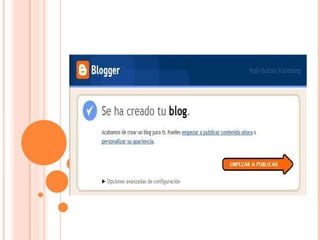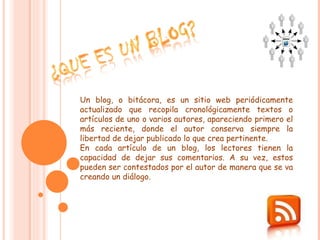 Un blog es un sitio web actualizado periódicamente que recopila cronológicamente artículos de uno o más autores. Los lectores pueden comentar cada artículo y los autores pueden responder, creando un diálogo. El primer blog fue creado en 1993 y consistía en una lista de sitios web con comentarios. A partir del 2000, los blogs se popularizaron con servicios gratuitos como Blogger. Los blogs pueden usarse como diarios personales, sitios de noticias o para expresar ideas.