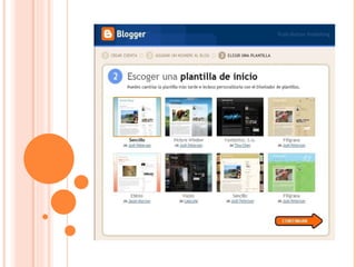 Los blogs son sitios web actualizados periódicamente que presentan artículos en orden cronológico inverso, permitiendo que los lectores dejen comentarios que pueden ser respondidos por el autor. El primer blog fue creado en 1993 por Tim Berners-Lee y consistía en una lista de sitios web con enlaces y comentarios breves. Los blogs se popularizaron a partir del 2000 y ahora se usan comúnmente para llevar bitácoras personales, compartir noticias y expresar ideas de manera interactiva.
