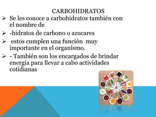 Los carbohidratos, también conocidos como hidratos de carbono o azúcares, cumplen la función importante de brindar energía para las actividades cotidianas. Existen dos tipos principales de carbohidratos: los hidratos de carbono simples como la fructuosa y la sacarosa, los cuales son de rápida digestión; y los hidratos de carbono complejos como la celulosa y la hemicelulosa, los cuales se digieren más lentamente y mantienen constantes los niveles de azúcar en la sangre. La principal función de los carbohid