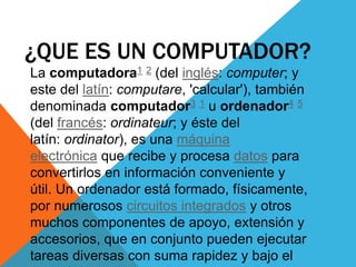 Un computador es una máquina electrónica que recibe datos, los procesa y convierte en información útil. Está compuesto de hardware físico como circuitos y componentes, y software intangible como programas y datos. Un computador típicamente tiene una unidad central de procesamiento, memoria y periféricos de entrada/salida para procesar datos, emitir información y ser programable para diversas tareas.