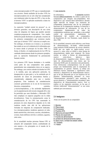 El documento habla sobre 3 temas principales: 1) Que es un computador y sus características, 2) Que es una CPU y sus funciones, 3) Que es una memoria y sus componentes. Explica que un computador procesa datos para generar información útil, una CPU interpreta instrucciones de programas y procesa datos, y la memoria almacena datos de forma temporal para su procesamiento.