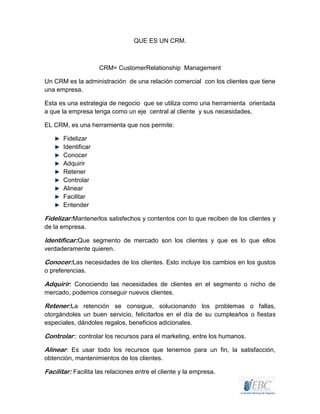 El documento explica qué es un CRM (Customer Relationship Management) y por qué es necesario para las empresas. Un CRM es una herramienta que permite fidelizar, identificar, conocer, adquirir y retener clientes mediante el control y alineamiento de recursos para satisfacer las necesidades de los clientes. Un CRM es importante porque ayuda a las empresas a centrarse en el cliente en mercados competitivos y a mantener una ventaja competitiva.