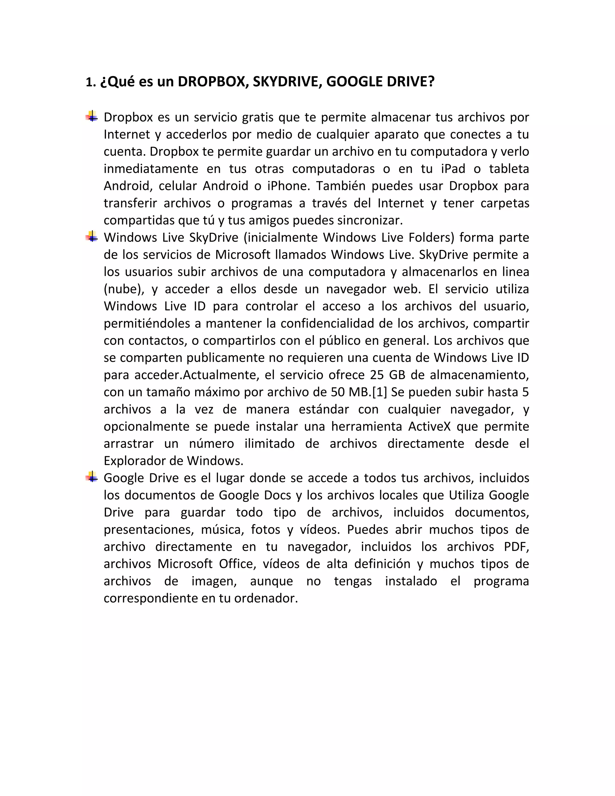 Dropbox, SkyDrive y Google Drive son servicios en la nube que permiten a los usuarios almacenar y acceder archivos desde cualquier dispositivo. Dropbox sincroniza automáticamente archivos entre dispositivos y permite compartir carpetas. SkyDrive ofrece 25GB de almacenamiento gratuito y permite subir hasta 5 archivos a la vez desde un navegador. Google Drive almacena documentos de Google y archivos locales, y permite abrir varios tipos de archivos directamente desde un navegador.