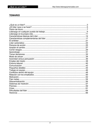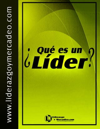 El documento define qué es un líder y explica que un líder es alguien que puede influir en los demás y guiar a un equipo hacia el logro de objetivos comunes a pesar de no tener necesariamente una posición de autoridad jerárquica. También destaca que un líder se caracteriza por tener una visión de futuro que motiva a los demás e ilusiona al equipo. Además, explica que el liderazgo puede ejercerse en cualquier puesto de trabajo y que los líderes deben mantener la coherencia entre su vida profesional y personal.
