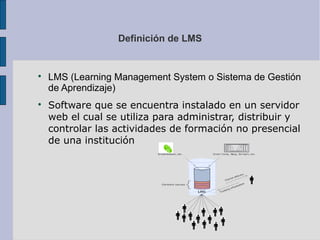 Un LMS (Sistema de Gestión de Aprendizaje) es un software que se utiliza para administrar el aprendizaje en línea mediante la gestión de usuarios, materiales educativos, actividades y evaluaciones. Ofrece ventajas como una mayor eficiencia del profesorado y el aprendizaje autónomo de los estudiantes, pero también requiere más motivación por parte de los estudiantes y recursos técnicos. Existen LMS de código abierto como Moodle y Chamilo, así como opciones de pago como WebCT y Blackboard.