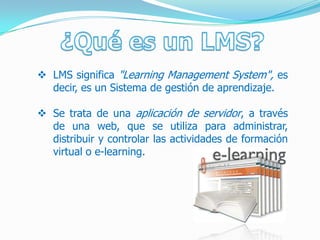 El documento describe lo que es un LMS, sus características, ventajas y desventajas, y tipos. Un LMS es un sistema de gestión de aprendizaje que se utiliza para administrar contenidos y actividades de formación virtual a través de una plataforma web. Proporciona funciones como gestionar usuarios, recursos y evaluaciones. Existen LMS comerciales y de código abierto como Moodle, Claroline y Atutor.