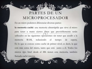 El microprocesador, también conocido como micro, es el cerebro de la computadora. Es un chip que contiene transistores que permiten realizar las tareas asignadas. Los microprocesadores más comunes de Intel para equipos portátiles y de escritorio incluyen los procesadores Pentium, Celeron, Core i3, Core i5, Core i7 y Xeon, los cuales varían en características como el número de núcleos, caché y velocidad.