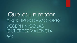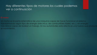 El documento describe diferentes tipos de motores. Explica que un motor transforma algún tipo de energía, como eléctrica o de combustibles fósiles, en energía mecánica para realizar trabajo. Luego describe tres tipos principales de motores: motores térmicos, que transforman calor en trabajo mecánico; motores de combustión interna, que obtienen energía mecánica directamente de la combustión de un combustible; y motores eléctricos, que obtienen trabajo a partir de una corriente eléctrica.