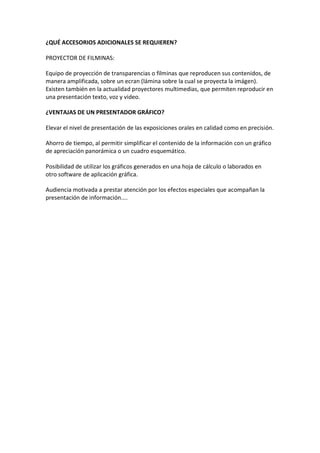 Un presentador gráfico es un programa que crea diapositivas electrónicas con información para ser proyectadas a grupos. Los presentadores gráficos modernos pueden incluir gráficos, sonido, video, animaciones u otros objetos. El presentador gráfico más popular es PowerPoint de Microsoft, que forma parte de Microsoft Office y funciona en Windows y Mac.