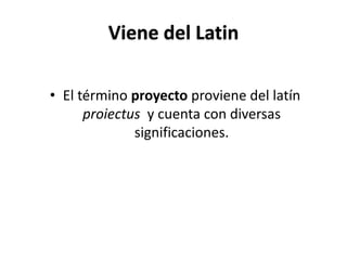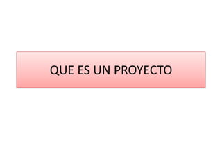 Un proyecto es un conjunto de actividades interrelacionadas y coordinadas para alcanzar un objetivo. Los proyectos pueden ser productivos, buscando ganancias, o públicos/sociales, buscando mejorar la calidad de vida. Un proyecto involucra las etapas de idea, diseño, ejecución y evaluación. La documentación de un proyecto incluye informes técnicos y administrativos, así como manuales.