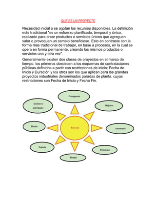 Este documento define qué es un proyecto. Explica que un proyecto es un esfuerzo planificado, temporal y único para crear productos o servicios únicos que agreguen valor o provoquen un cambio beneficioso. Generalmente hay dos clases de proyectos definidos por sus restricciones de tiempo: proyectos públicos con fechas de inicio y duración fijas, y proyectos industriales con fechas de inicio y fin fijas. El documento también define conceptos clave relacionados como presupuesto, objetivo, autonomía, problemas, tiempo y