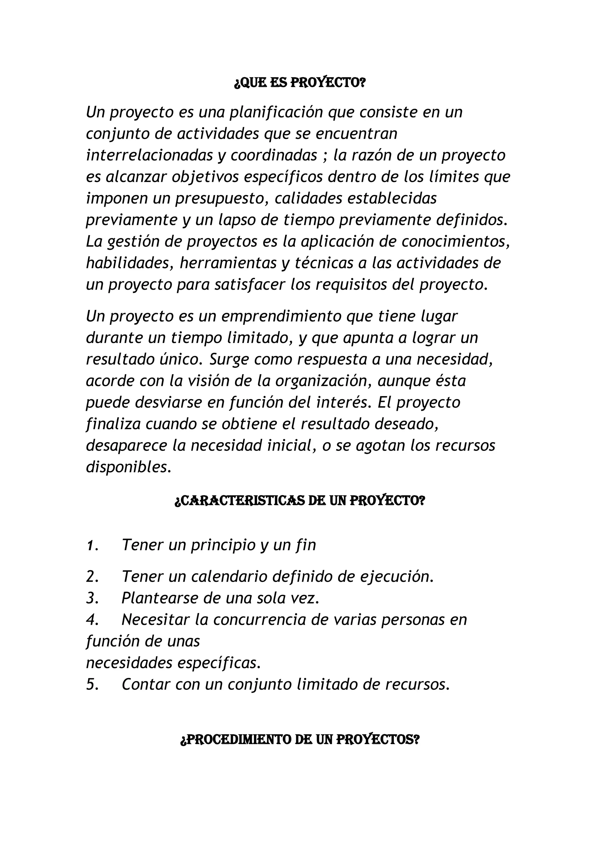 Un proyecto es un conjunto de actividades interrelacionadas y coordinadas que tienen un objetivo específico, presupuesto y plazo definidos. La gestión de proyectos aplica conocimientos y herramientas para satisfacer los requisitos del proyecto. Un proyecto tiene un inicio y fin, calendario definido, se plantea de una sola vez y requiere la participación coordinada de varias personas usando recursos limitados. Un diagrama de Gantt permite modelar y comunicar gráficamente el plan y progreso de las tareas de un proyecto a