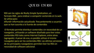 RSS es un formato XML para distribuir contenido actualizado frecuentemente desde fuentes en la web a usuarios suscritos. Los usuarios pueden leer RSS a través de lectores de software, navegadores web o lectores en línea. Los lectores RSS recopilan actualizaciones de páginas web suscritas y las muestran para que los usuarios puedan mantenerse informados de manera conveniente.