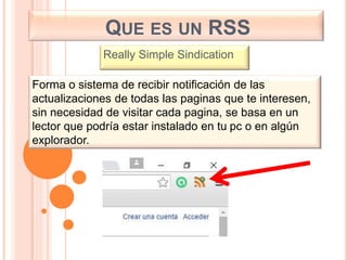 Este documento describe las herramientas RSS (Really Simple Sindication) y los lectores RSS. RSS permite recibir notificaciones sobre actualizaciones de páginas sin visitar cada página. Los lectores RSS agregan páginas y mantienen al usuario informado sobre nuevas publicaciones. El documento menciona dos lectores RSS populares, Feedreader y Newsmonster, y explica cómo un lector RSS en el navegador permite recibir actualizaciones sin descargar un programa.