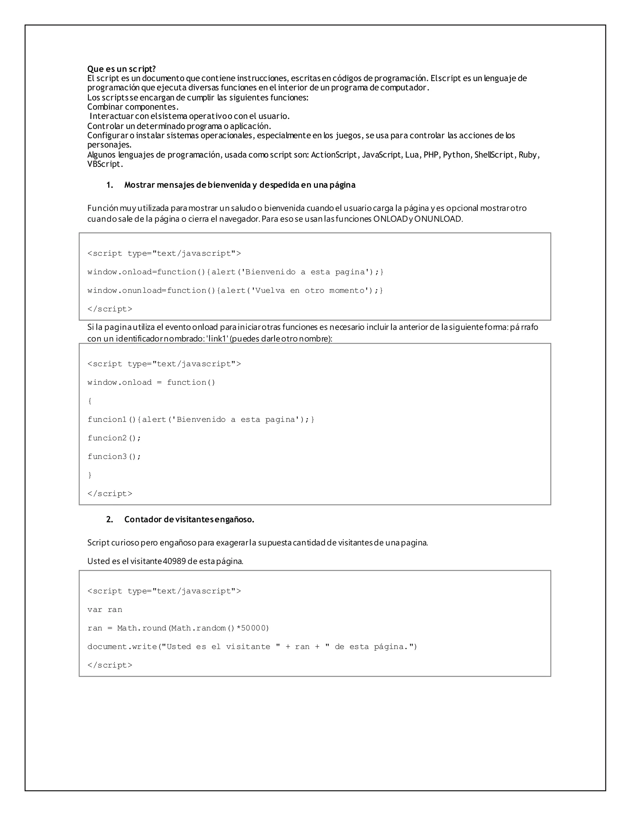 Un script es un documento que contiene instrucciones escritas en códigos de programación para ejecutar diversas funciones dentro de un programa de computadora, como combinar componentes, interactuar con el sistema operativo o usuario, y controlar programas y aplicaciones. Algunos lenguajes de programación comúnmente usados para scripts incluyen JavaScript, PHP y Python.