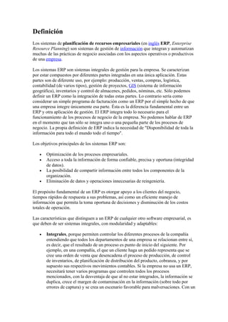Los sistemas de planificación de recursos empresariales (ERP) son sistemas integrados de gestión que automatizan los procesos operativos de una empresa como producción, ventas, compras y contabilidad. Un ERP integra estas funciones en una única aplicación con acceso a una base de datos centralizada para optimizar los procesos, compartir información y tomar decisiones oportunas. Los ERP se caracterizan por ser modulares y adaptables a las necesidades específicas de cada empresa.