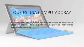 El documento proporciona una historia general de la computación, desde los primeros computadores analógicos y digitales hasta los teléfonos inteligentes y redes sociales modernas. Cubre temas como la evolución de las generaciones de computadoras, el desarrollo del microprocesador y circuito integrado, y el surgimiento de Internet y las computadoras personales.