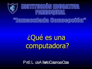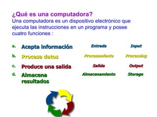 Una computadora es un dispositivo electrónico que acepta información como entrada, la procesa, produce una salida y almacena resultados. Tiene cuatro partes principales: la unidad central de procesamiento, la memoria, el almacenamiento y las unidades de entrada y salida. Ha pasado por cuatro generaciones tecnológicas definidas por los componentes utilizados como los bulbos, los transistores y los circuitos integrados.