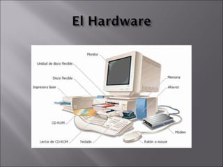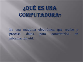 Una computadora es una máquina electrónica que recibe datos, los procesa y los convierte en información útil. Está compuesta de hardware, que son los componentes físicos como el procesador y la memoria, y software como los programas. Los datos se introducen a través de dispositivos de entrada como el teclado o mouse y se muestran a través de dispositivos de salida como el monitor. Un sistema operativo gestiona los recursos de la computadora y permite la interacción con el usuario.