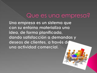 Tres factores necesarios para cualquier empresa son personas, capital y trabajo. Las personas representan el talento humano como administradores, propietarios y trabajadores. El capital son las aportaciones de los propietarios como dinero, maquinaria o mercancías. El trabajo es la actividad realizada por las personas para lograr los objetivos de la empresa como la producción de bienes o prestación de servicios.